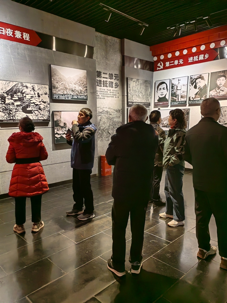 在夹金山纪念馆中,一幅幅图片与实物无声诉说着九十年前的极限挑战。展柜里的破旧单衣、草绳捆绑的烂布鞋,让同志们深受感动,感恩先烈们为爱的代价,换来今天的幸福生活。纪念馆一角展现了藏族同胞当向导、献青稞、救护伤员的场景,随行黄怀平老师还给大家讲述了红军三次翻越夹金山的历史场景,让随行的党员们深深体会夹金山是军民鱼水情的见证地,也是革命信念的“加油站”,深刻理解“群众路线是党的生命线”,红军的胜利源于钢铁意志和植根于人民的初心。
