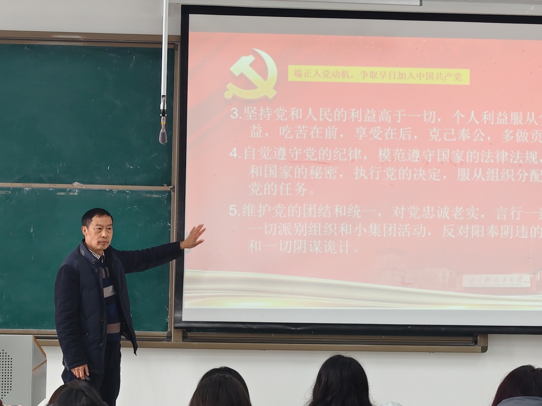 我校关工委副主任余腾平老师作为主讲人,以入党动机的核心要义与时代价值为切入点,强调入党不仅是个人政治追求起点,更关乎党的事业根基。余腾平指出,青年学生入党需摒弃功利、盲从、虚荣等错误倾向,牢记“为中国人民谋幸福,为中华民族谋复兴”的初心使命;通过讲述陈毅、钟南山、张定宇、江姐等共产党人的感人事迹,阐明正确入党动机是为人民幸福、民族复兴而奋斗,并讲解如何以实际行动接受党组织考验。