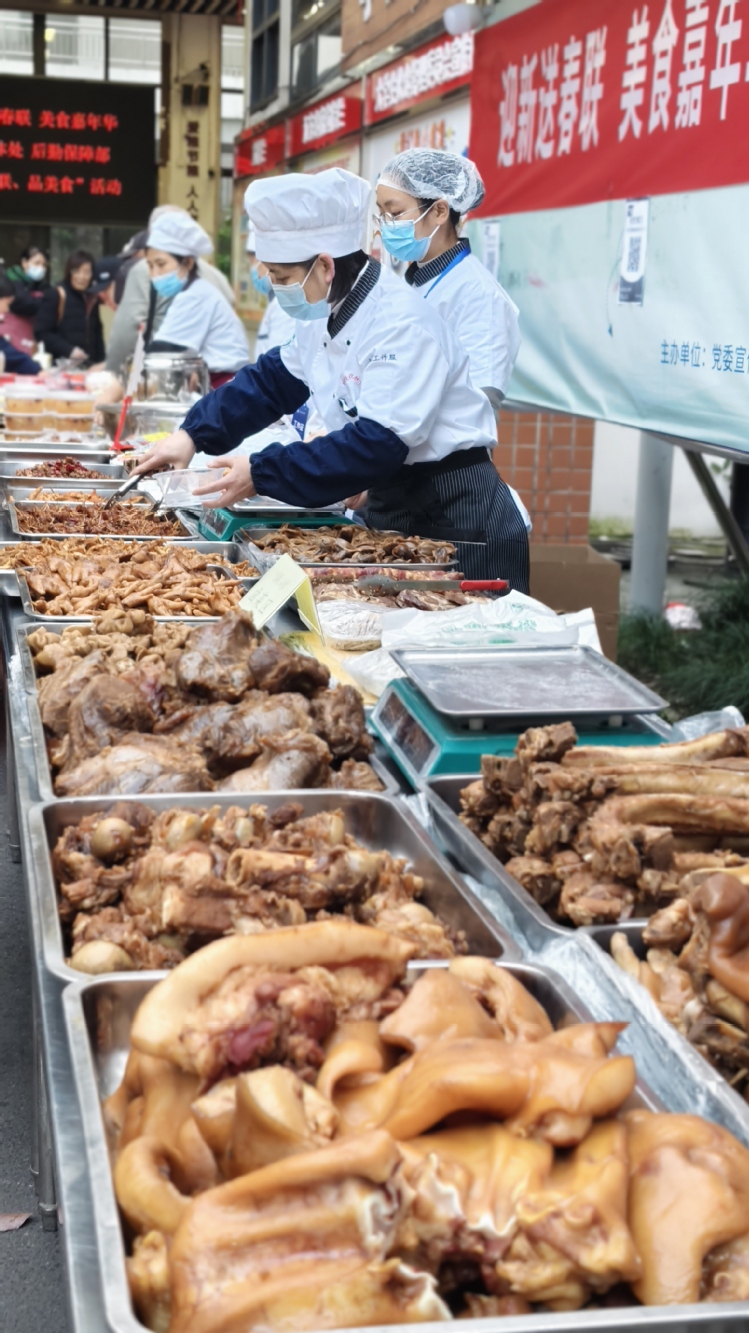 与此同时,“年味食足”美食嘉年华同步开展。后勤保障部汇东食府和师生服务部精心筹备了丰富多样的美食,设置免费品尝区与现场售卖区。免费品尝区的酒酿丸子、银耳汤、各式卤味及休闲小吃暖意融融;售卖区的卤猪蹄、炸酥肉、梅菜扣肉等特色食品价廉物美,深受欢迎。美食不仅满足了味蕾,更传递出“家”的温暖。